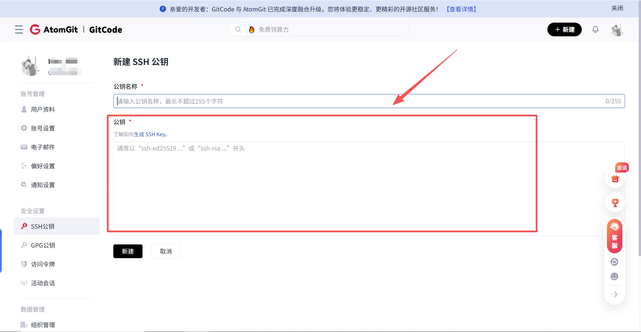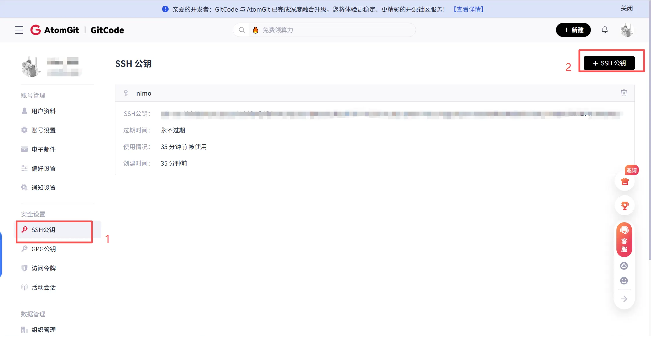 - 你没有正确配置 SSH 公钥(即没有将公钥添加到 GitCode 的账户中)。