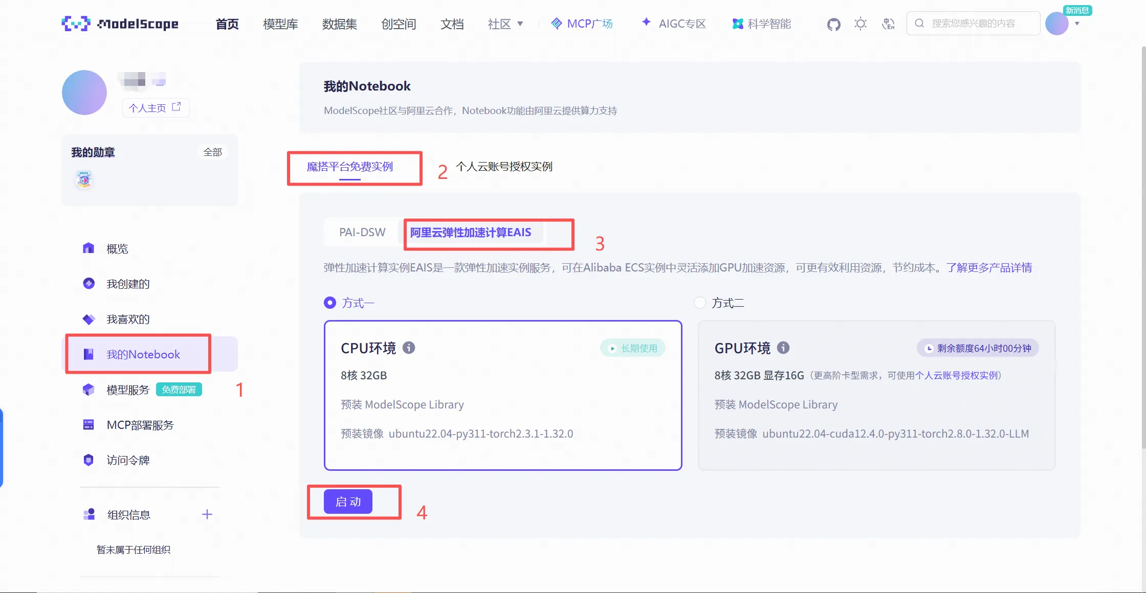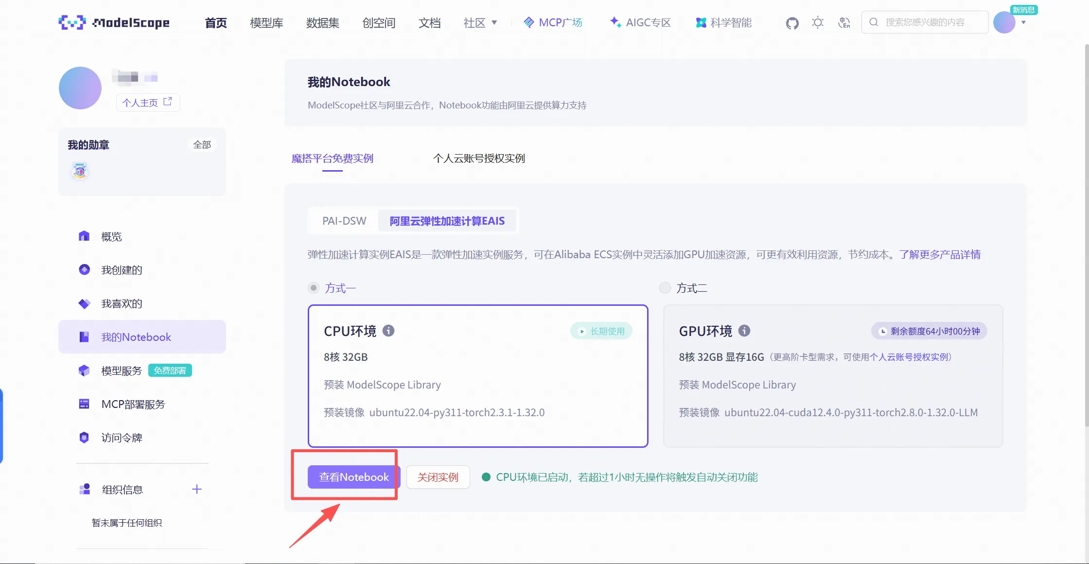 这里直接使用魔塔社区的免费提供的实例,CUP环境为8核 32GB 预装镜像:ubuntu22.04-py311-torch2.3.1-1.32.0